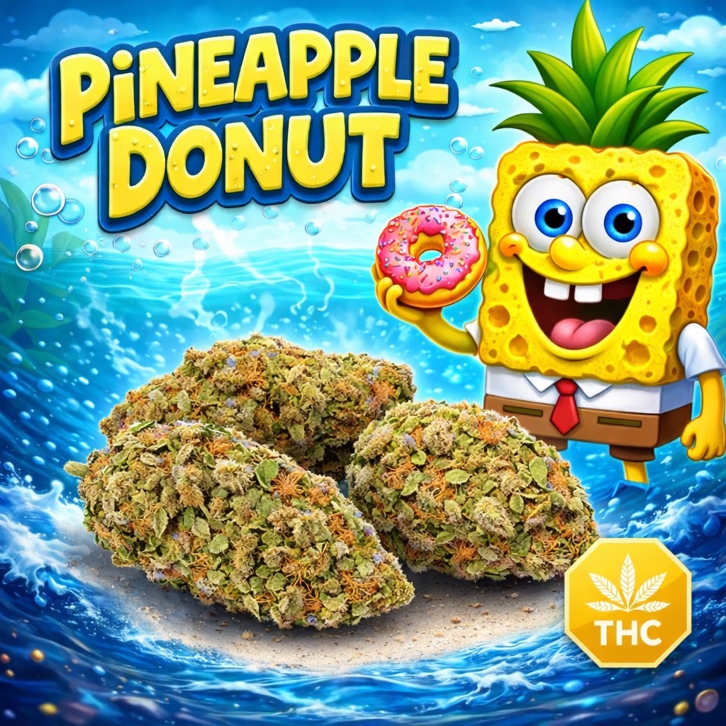 Pineapple Donut is a sativa dominant hybrid strain (70% sativa/30% indica) created through crossing the classic Franken Cakes X Gorilla Diesel #3 strains. Named for its amazing flavor, Pineapple Donut is the perfect tasty breakfast treat to get you on your feet and working on your day in no time flat. Much like its namesake treat, Pineapple Donut packs a super sweet and sugary classic donut flavor with touches of sharp pineapples and citrus. The aroma is very much the same, almost like you just opened a box of freshly baked pineapple doughnuts topped with layers of brown sugar. The Pineapple Donut high will hit you quickly, electrifying your brain a few moments after your final exhale with a burst of buzzy, happy energy. You’ll be super euphoric and outgoing, although seriously lacking in the focus department at this point. Thanks to these bright effects and its super high 23-26% average THC level, Pineapple Donut is often suggested to treat very experienced patients with a variety of conditions including chronic fatigue, depression or mood swings, headaches or migraines, chronic pain and chronic stress. This bud has fluffy and oversized, spade-shaped emerald-green nugs with dark olive green leaves, super thin orange hairs and a frosty coating of sparkling, tiny white crystal trichomes.